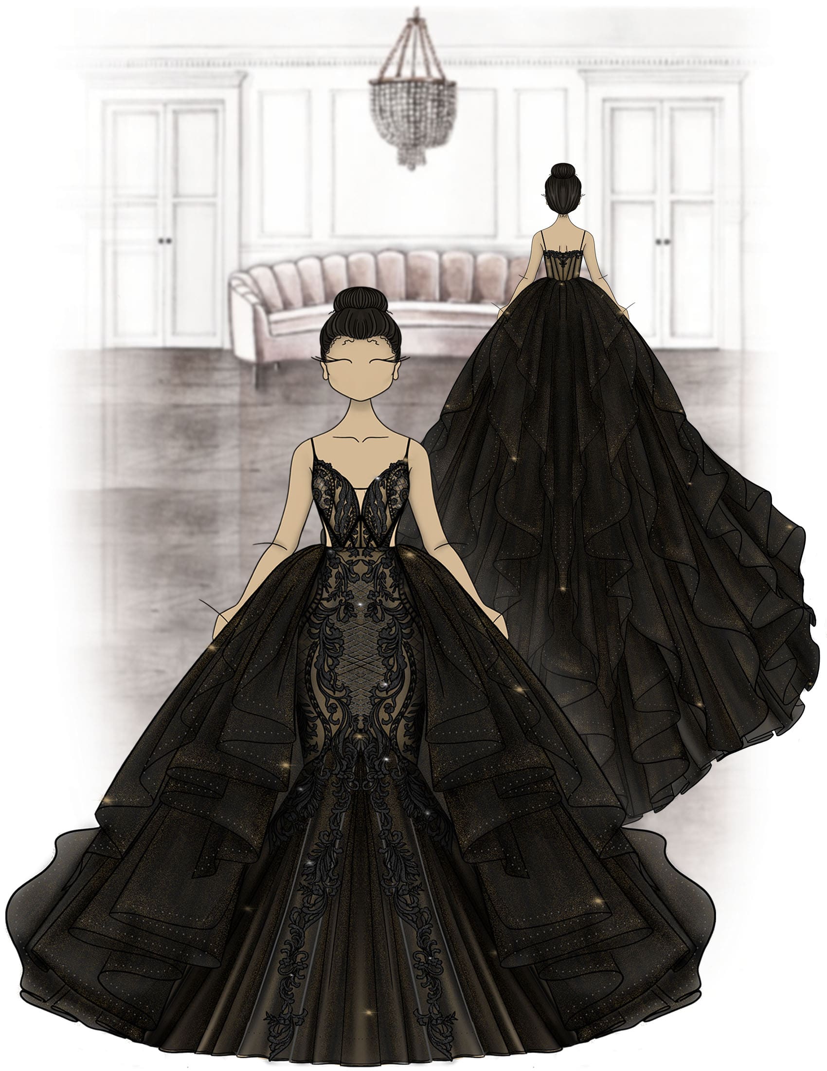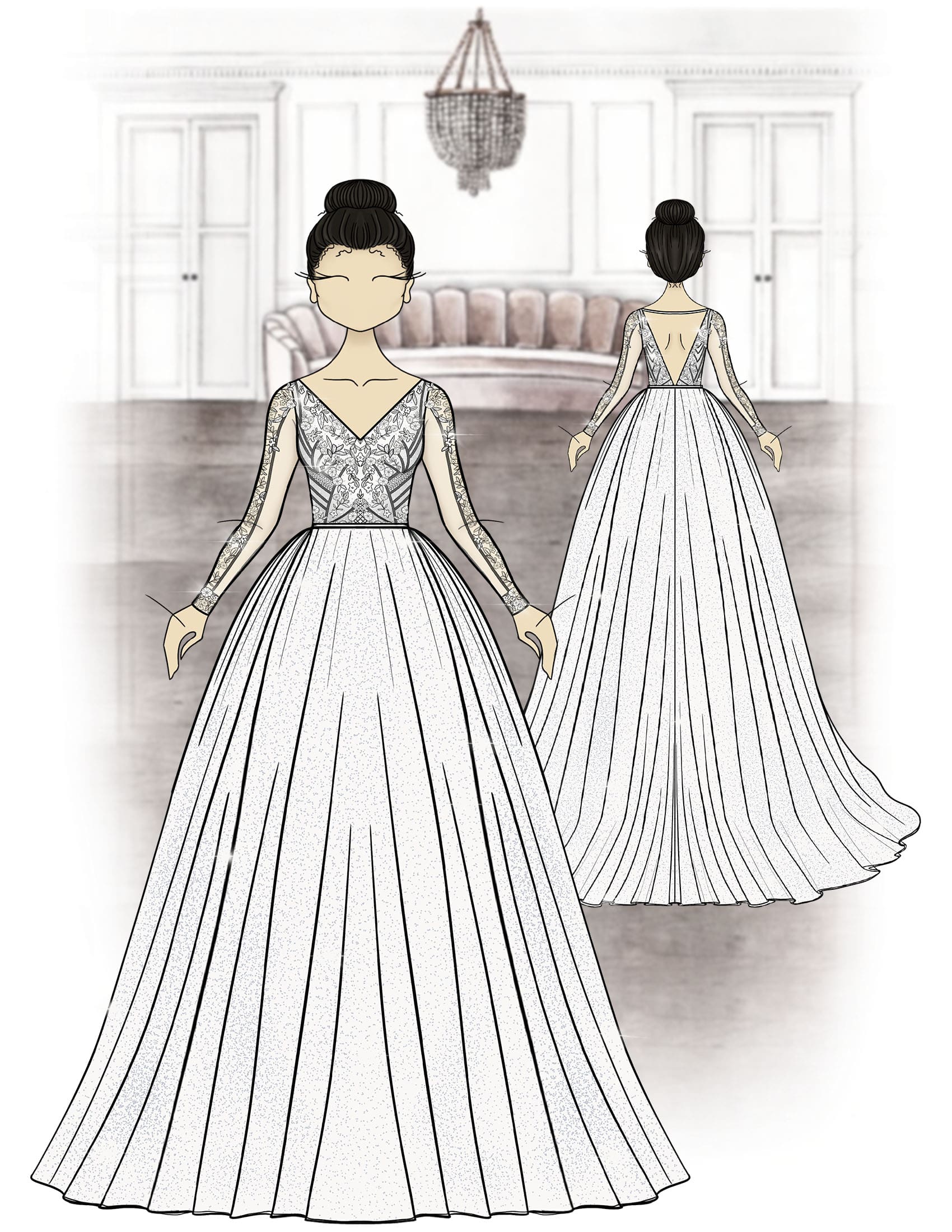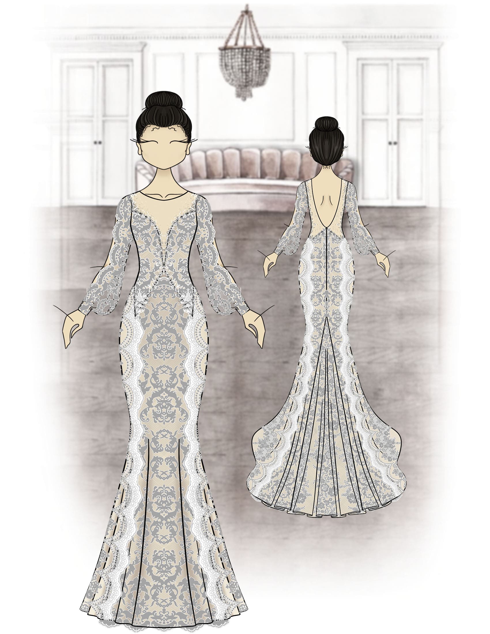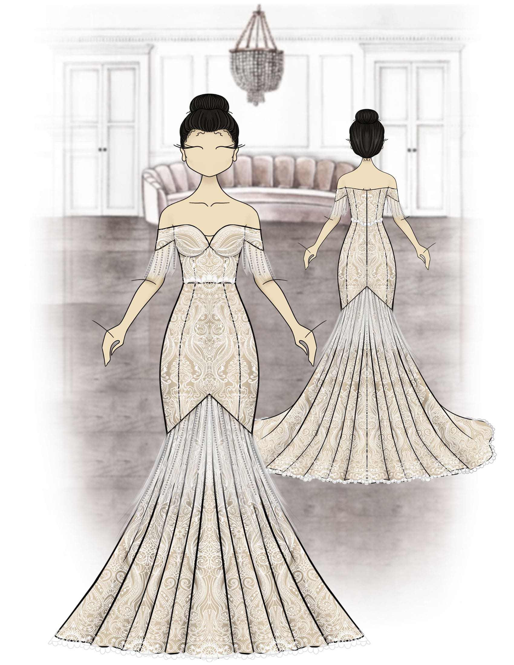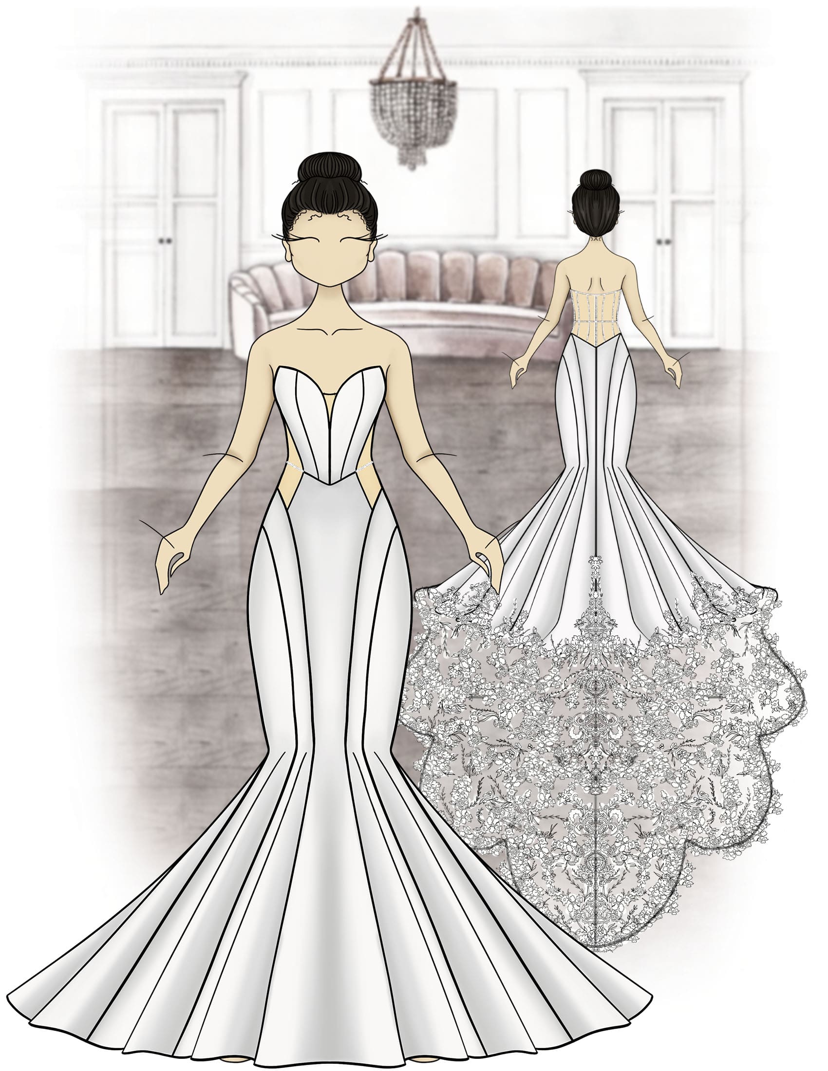 Our full wedding dress customization process is a much more client involved and hands on. At A.Cherie Couture, our clients are consulted by an A.Cherie dress designer every step of the design process from the initial sketch and concept, to the construction details of the design as well as the fabrication options that will ultimately fulfill the product of the client’s personalized custom dress design!