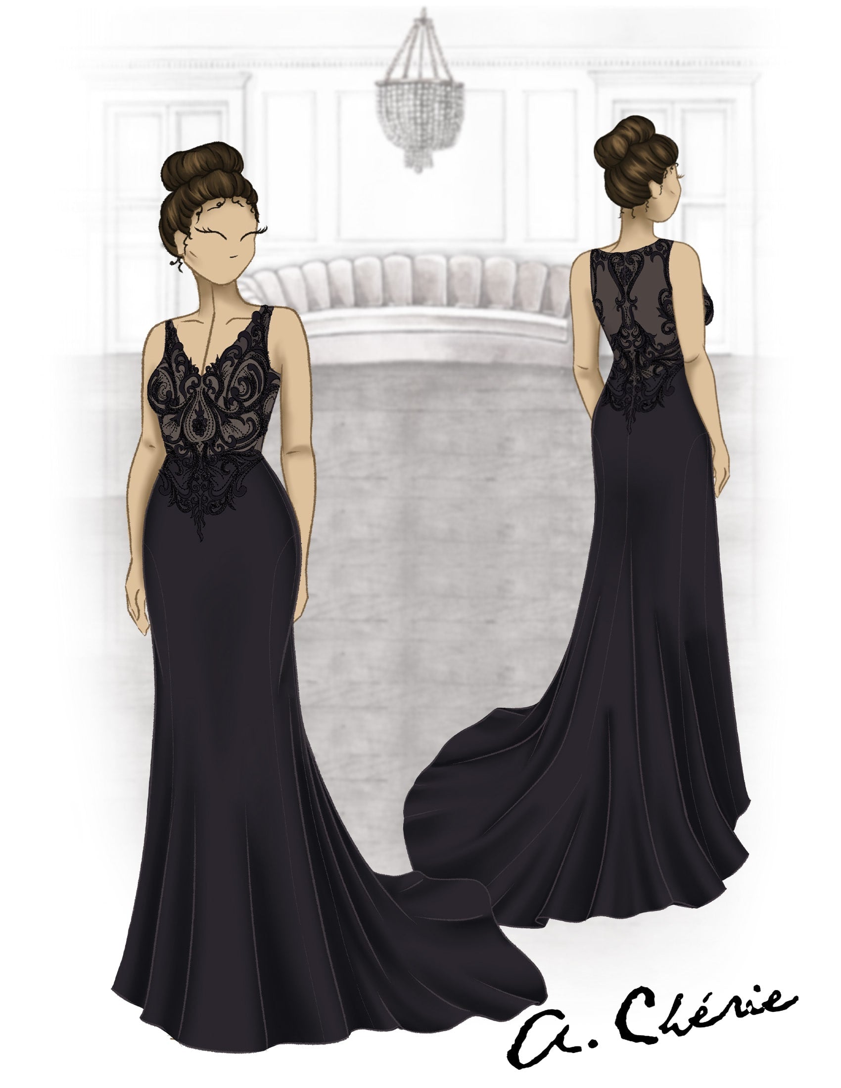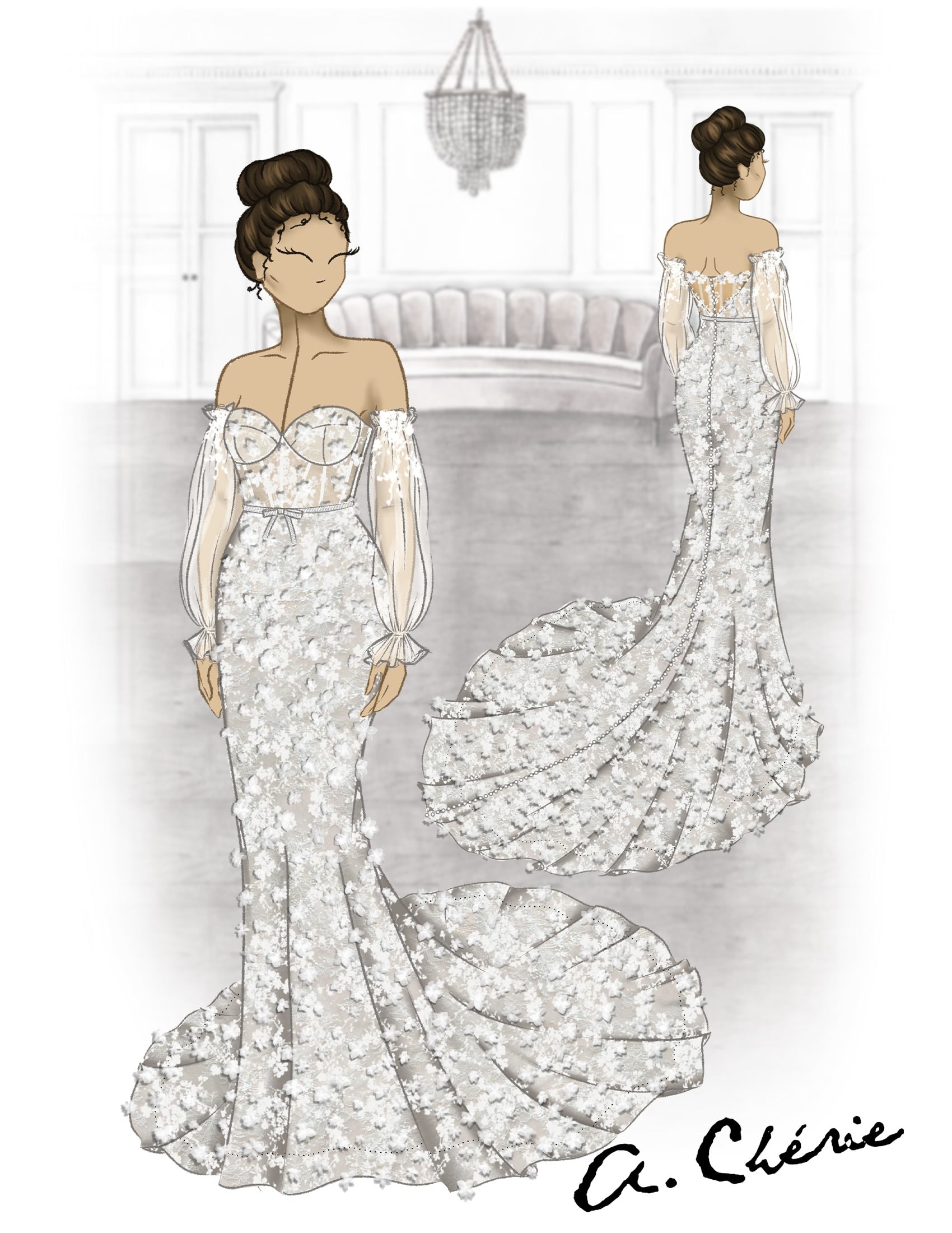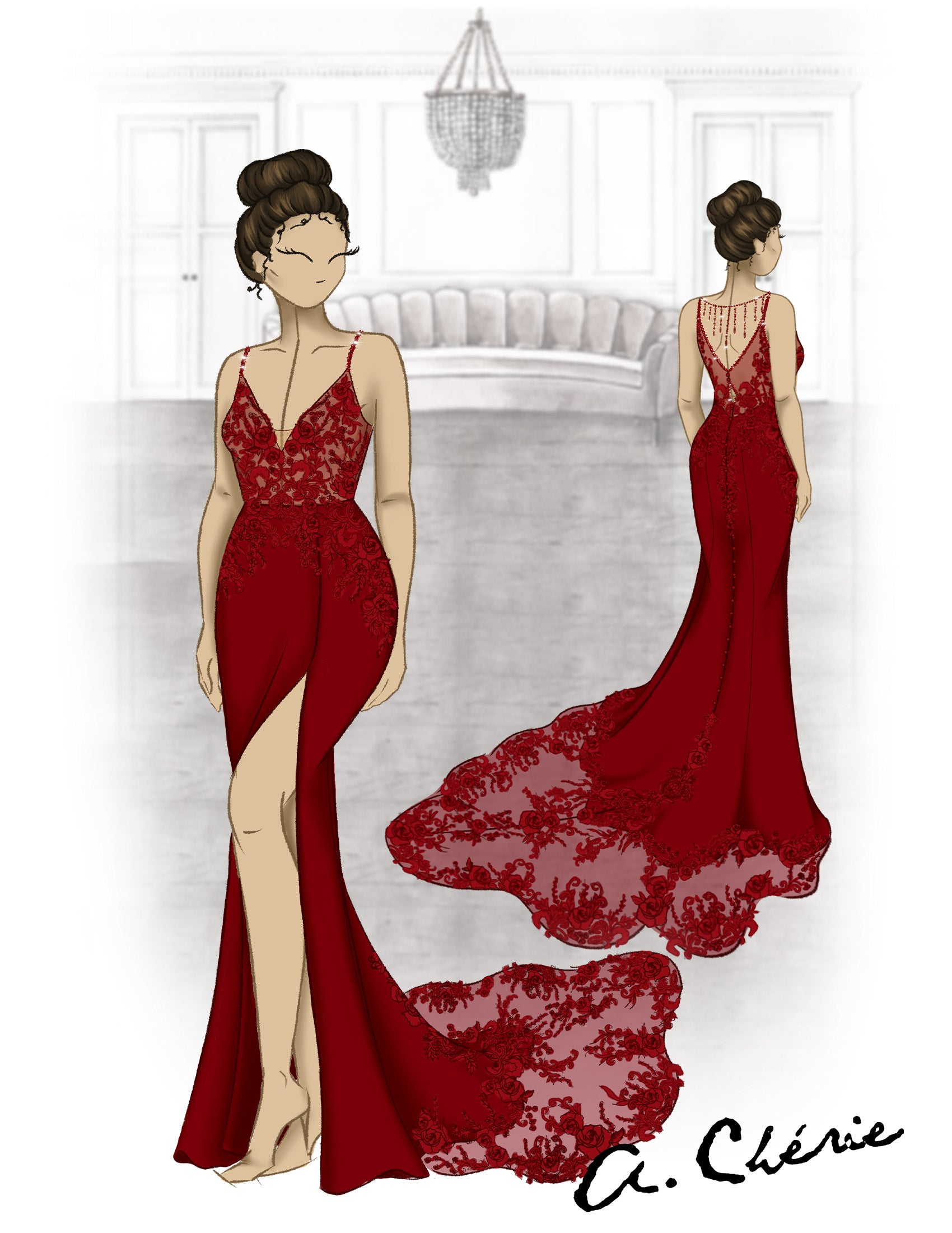 Colored computer illustrations are recommended for our brides who are mixing colors into their dream dress and creating a more customizable design who wish to see a more finalized design vs our pencil sketch option.