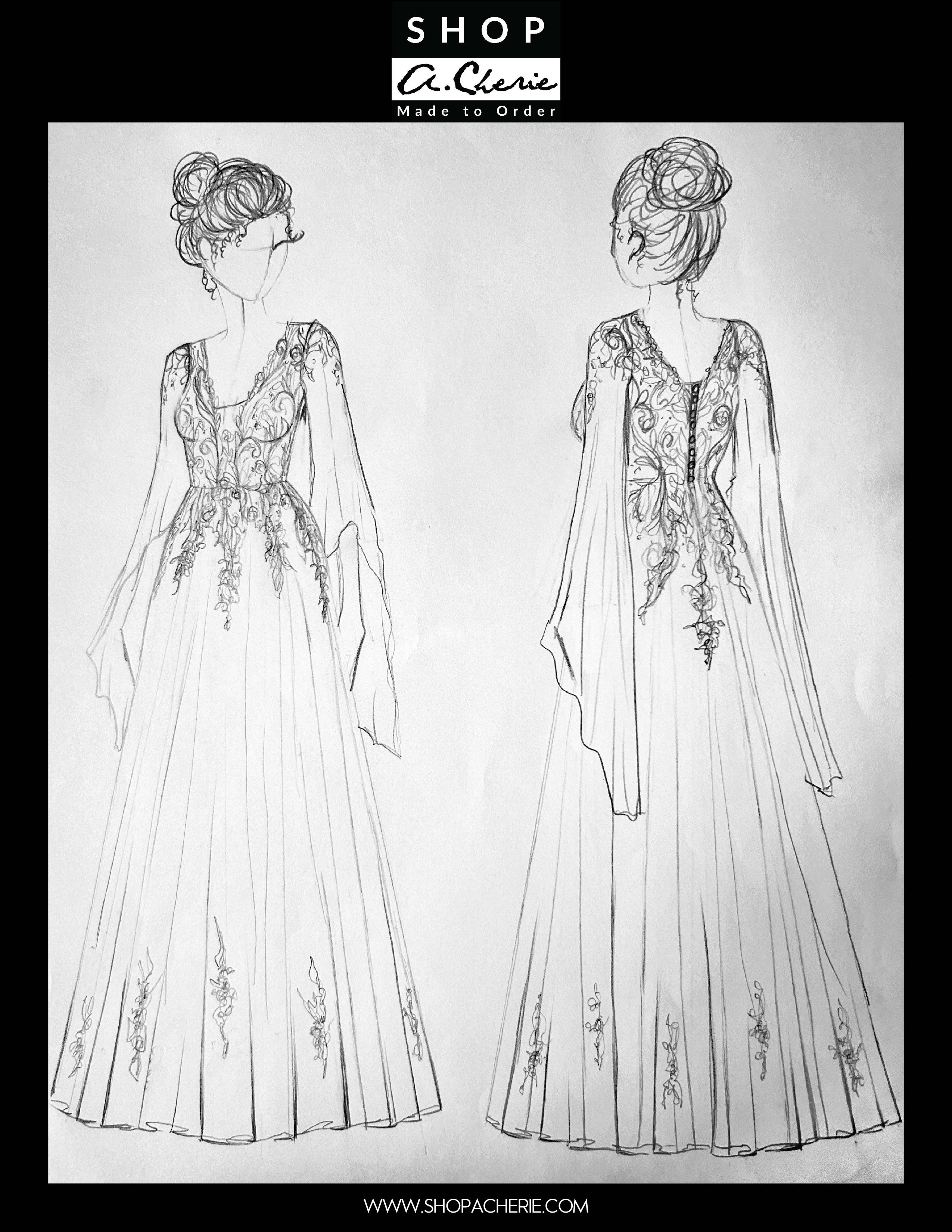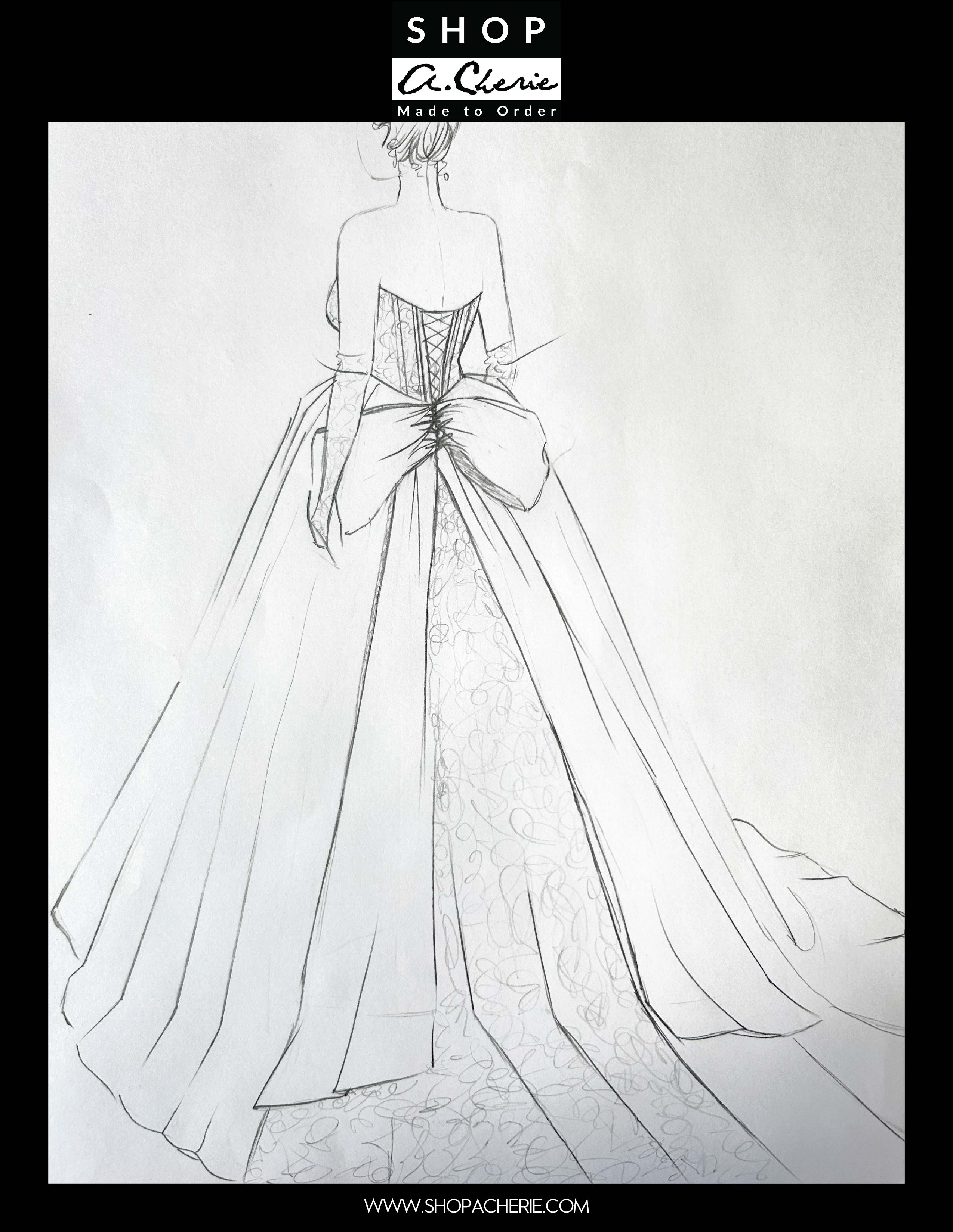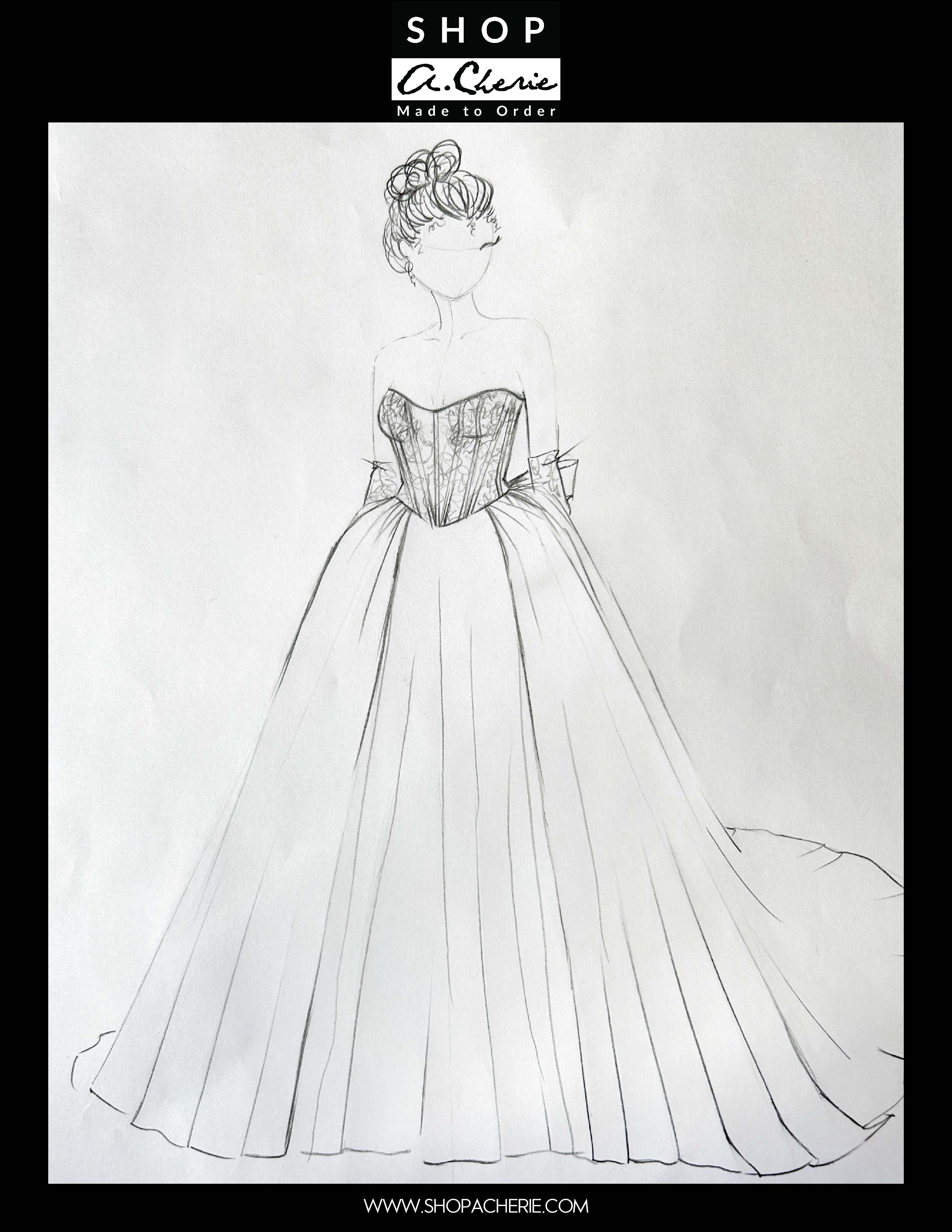 NO STOCK-made to order item with up to 3 revisions from customer's original personalized design. Further changes or full bodice/skirt design change from first sketch will result in a additional pencil sketch or illustration and will be charged accordingly as a second sketch or illustration.