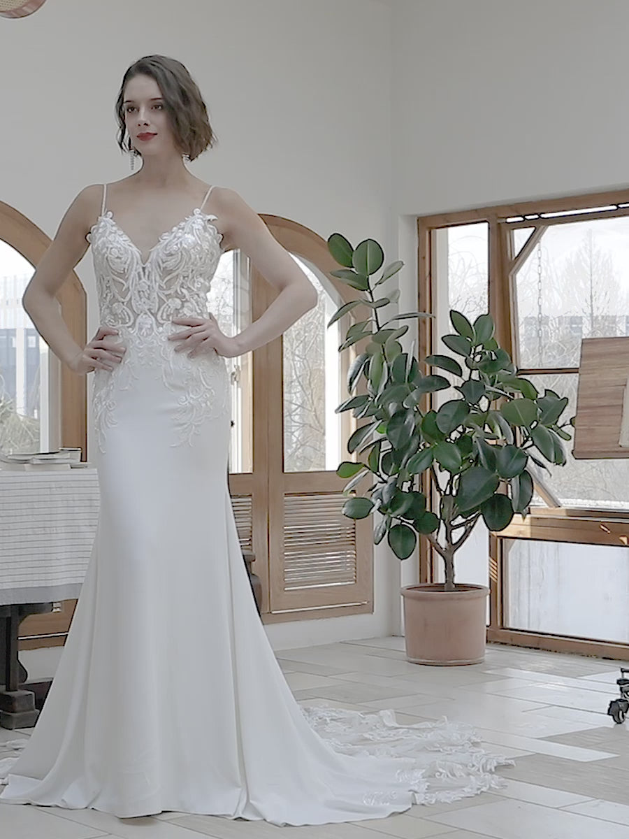 Floral Lace Crepe Fit & Flare Wedding Dress with Beaded Straps | Evelyn