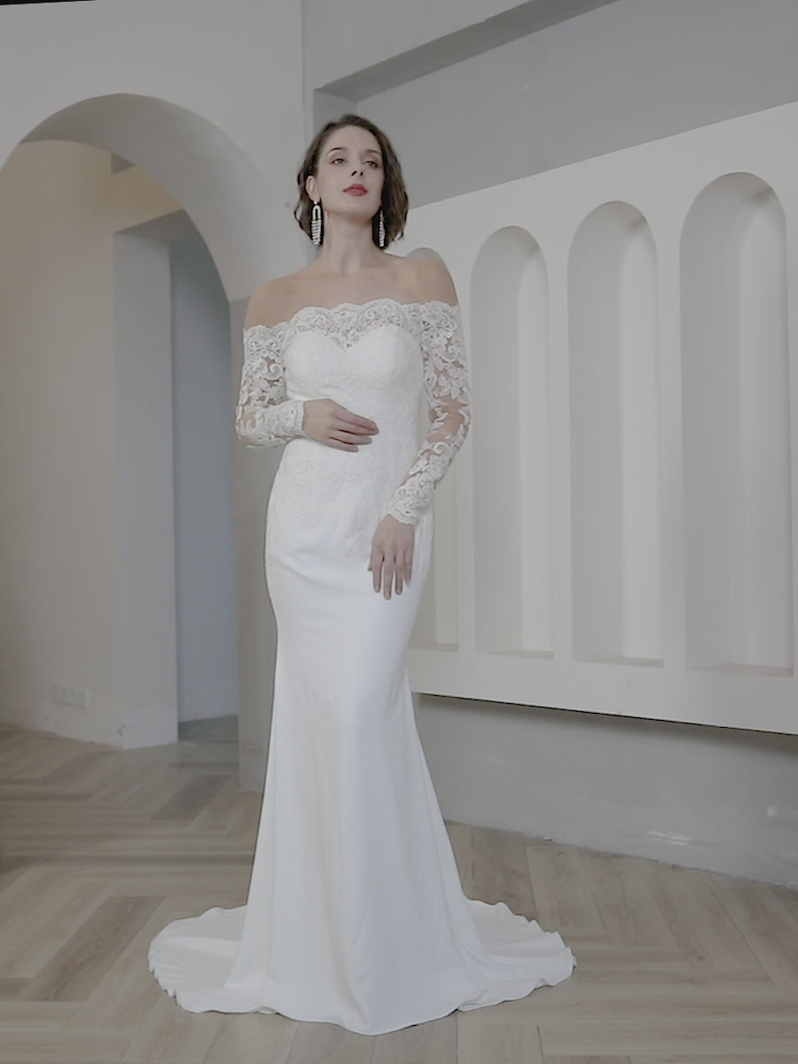 Off Shoulder Floral Lace Crepe Fit & Flare Wedding Dress | Halle