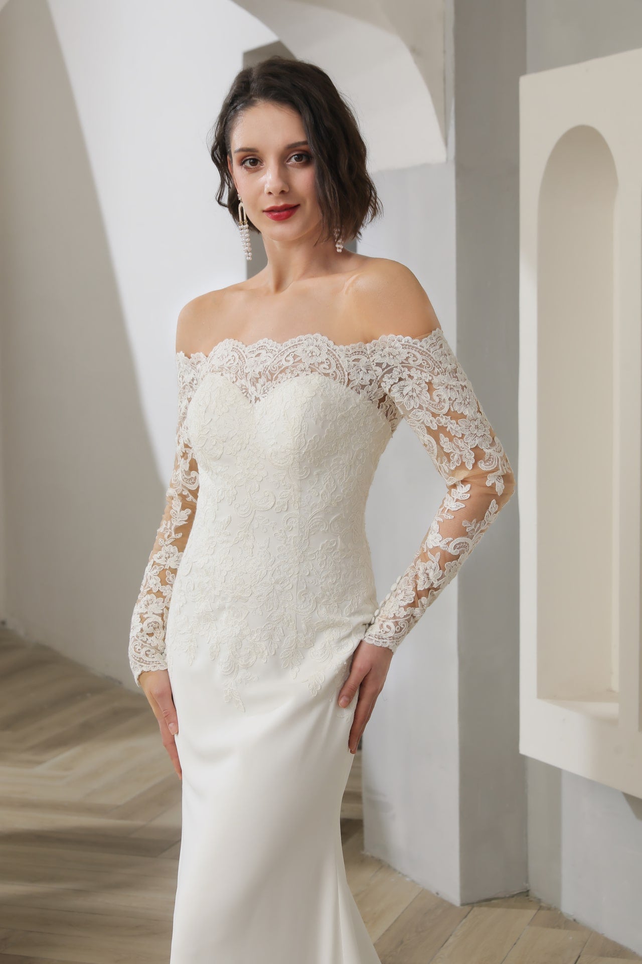 Shown with sheer fitted full length sleeves and a sweep length train.