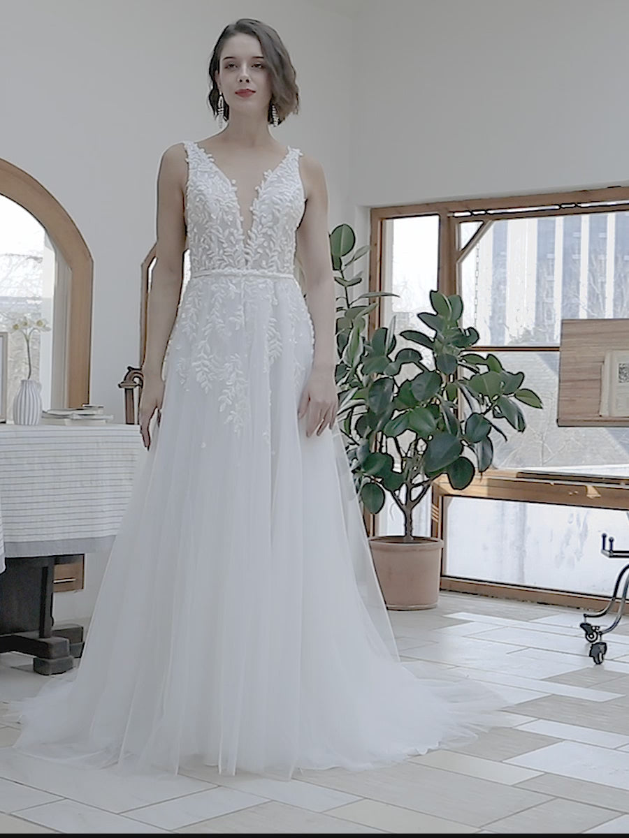 Plunge Neckline Beaded Foliage Lace A-Line Wedding Dress | Anna